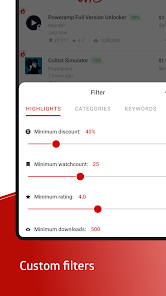 The minimum discount, download, view, and rating thresholds can be set using filters to personalize the sales list. In-app purchases or applications with ads can be hidden.