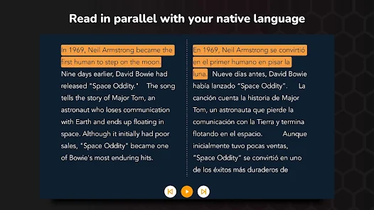 - Bilingual Learning Reinvented: Immerse yourself in stories, news, and songs presented side-by-side in your native language and the language you're learning. This unique approach allows for intuitive comprehension and rapid vocabulary acquisition.