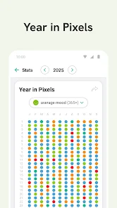 All your recorded activities are stored in diverse formats, making future review straightforward. Your entire year's progress is visually represented as a pixel chart, with each evenly distributed dot varying in color to reflect daily changes in mood and personal development. Tap any pixel to instantly revisit the memories and progress you've logged for that specific day, regardless of the activity type.
