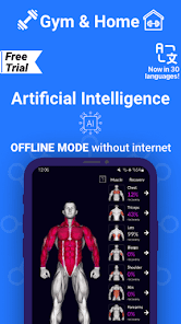 FitAI has a database of over 3900 exercises, including gym and bodyweight exercises to do at home. You can use it with dumbbells, barbell and kettlebell in the gym. We have exercises for chest, biceps, abs, quads, calves, triceps, hamstrings, lats, glutes, forearms, traps, and shoulder muscles. The most popular exercises are squats, lunges, planks, push-ups, sit-ups, pull-ups, burpees, sit-up abs. If you don't skip leg day, you can use our muscle reports and training analysis that focus on leg and arm exercises.