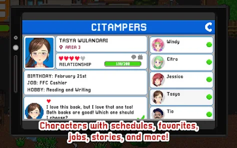 Dive into the sprawling 2D urban landscape of Citampi, where exploration is key. Interact with diverse characters, uncover hidden locations, and seize countless opportunities. A dynamic job market awaits, offering various roles to help you earn money and advance your career. From simple tasks to demanding professions, each job contributes to your financial stability. Experience a realistic time system, where day transitions to night, influencing your work schedule, social life, and decision-making.